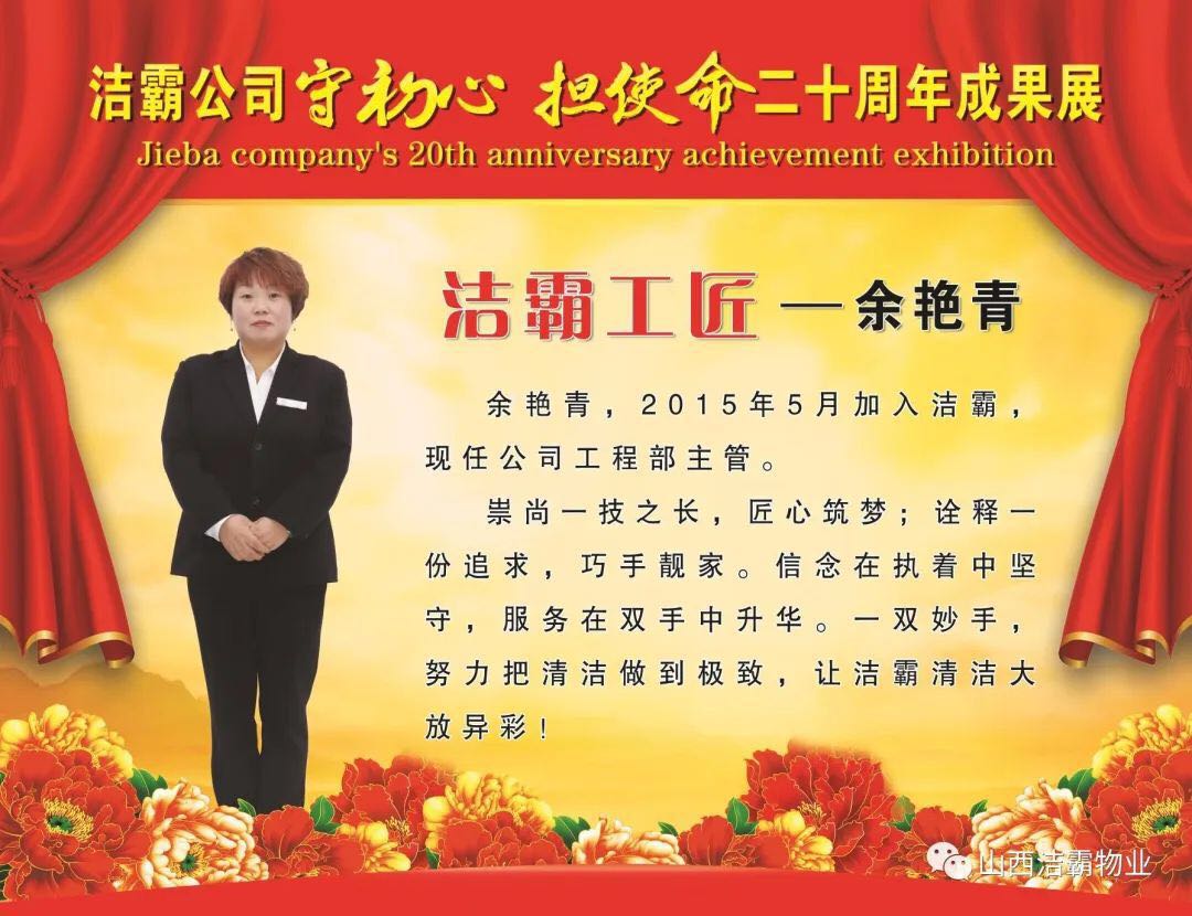 余艷青同志自2015年進(jìn)入潔霸以來,一直奮斗在工程部的第一線從事主管工作。工作中,余艷青同志愛崗敬業(yè),遵守職業(yè)道德,為人誠實(shí)守信;她熱愛工作,對待客戶熱情周到、耐心細(xì)致;工作中團(tuán)結(jié)同事,責(zé)任心強(qiáng),吃苦耐勞,服從大局,以公司的利益為重。在我市開展的“三洗六見一紅旗”活動和全國文明城市的創(chuàng)建活動中,她帶領(lǐng)員工高標(biāo)準(zhǔn)、高質(zhì)量、高效率地完成清洗美化工作,為扮靚晉城形象,打造城市優(yōu)美環(huán)境做出了突出貢獻(xiàn)。先后多次被公司評為優(yōu)秀員工等,2019年在公司成立20周年慶之際,她又被公司授予“潔霸工匠”稱號。
