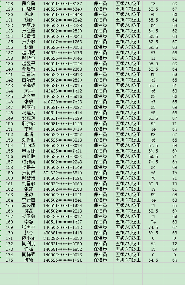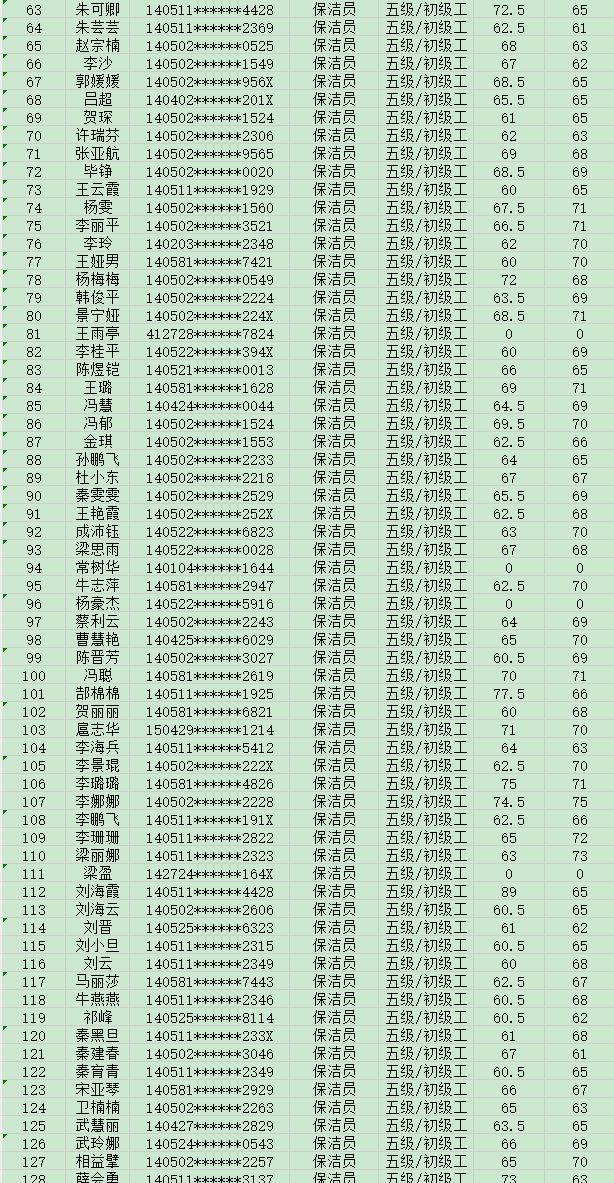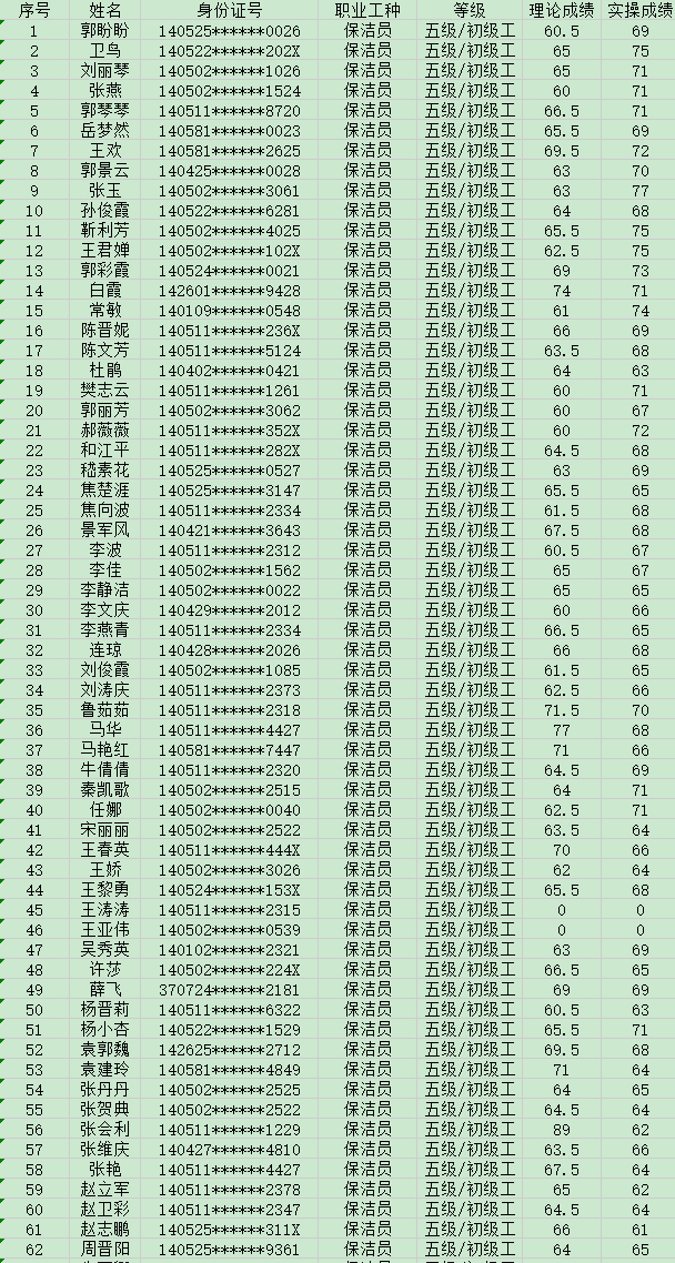 晉城市潔霸清潔服務(wù)股份有限公司職業(yè)技能等級(jí)認(rèn)定中心2024年6月2日第18批保潔員初級(jí)認(rèn)定人員成績(jī)公示
