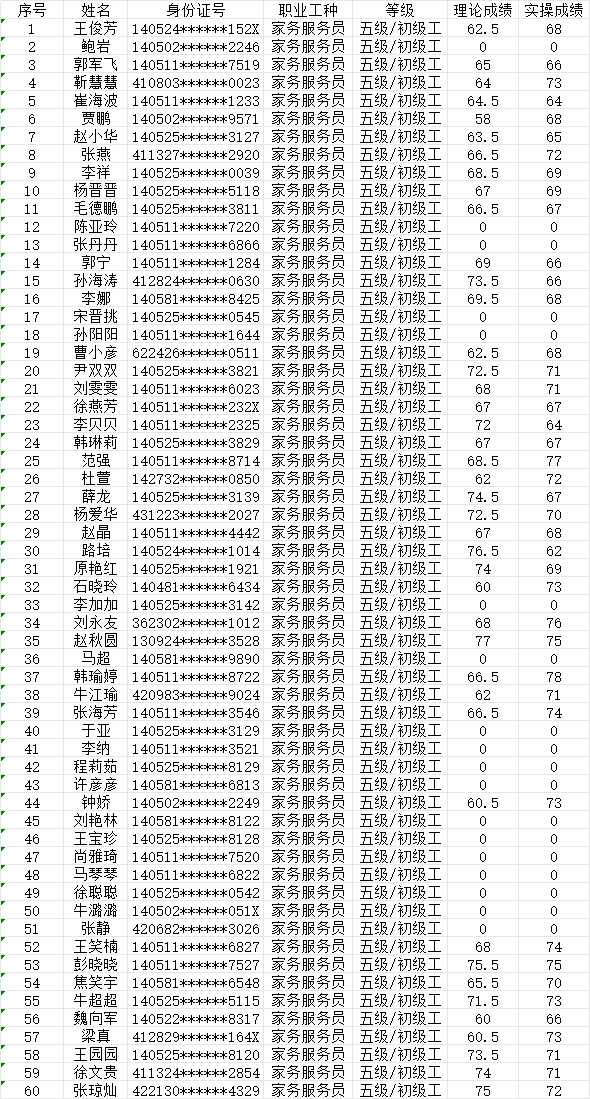 晉城市潔霸清潔服務(wù)股份有限公司職業(yè)技能等級(jí)認(rèn)定中心現(xiàn)將202477日認(rèn)定人員成績(jī)公示如下: