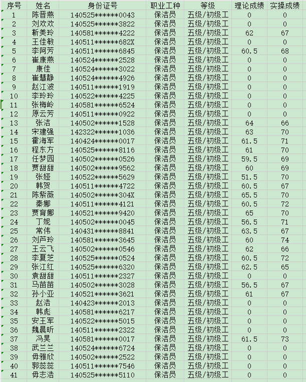 晉城市潔霸清潔服務(wù)股份有限公司職業(yè)技能等級(jí)認(rèn)定中心2024年8月4日第27批保潔員初級(jí)認(rèn)定人員成績公示
