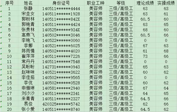 晉城市潔霸清潔服務(wù)股份有限公司職業(yè)技能等級(jí)認(rèn)定中心2024年10月13日第12批美容師高級(jí)認(rèn)定人員成績公示