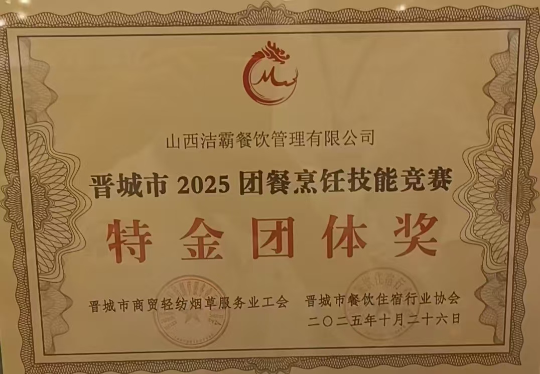 10月26日,由晉城市總工會(huì)、晉城市商務(wù)局、晉城市人力資源和社會(huì)保障局主辦,晉城市商貿(mào)輕紡煙草服務(wù)業(yè)工會(huì)委員會(huì)、晉城市餐飲住宿行業(yè)協(xié)會(huì)承辦的“情系職工 美好食光”晉城市2025團(tuán)餐烹飪技能競(jìng)賽在高都大酒店圓滿(mǎn)落幕,山西潔霸餐飲管理有限公司斬獲“特金團(tuán)體獎(jiǎng)”。